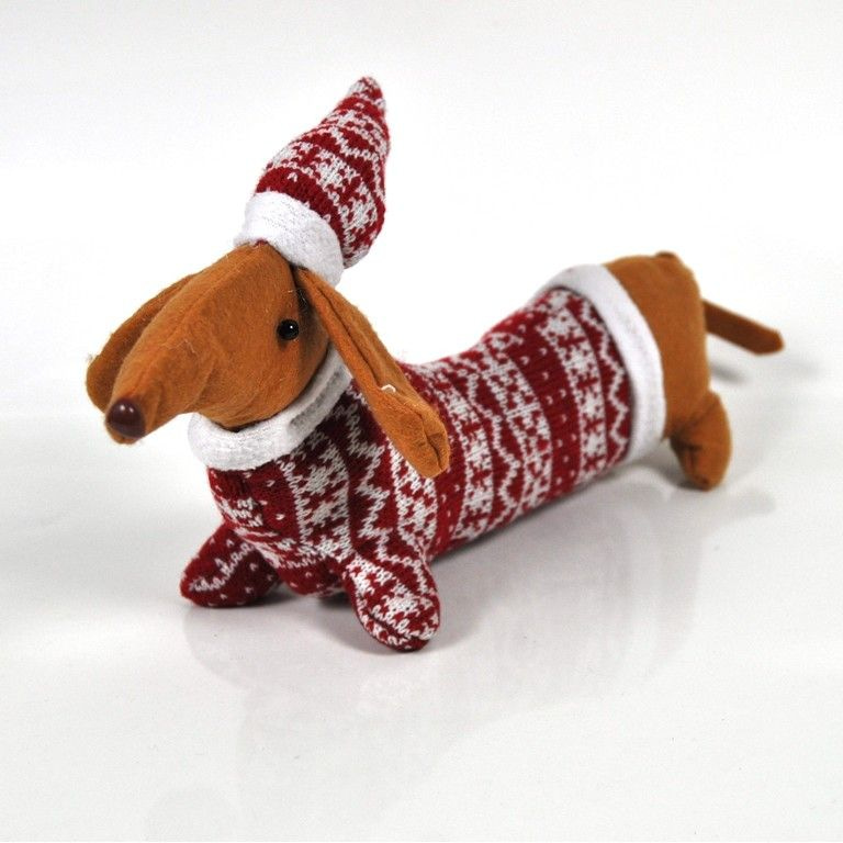 Cute plush Christmas Dachshund dressed in festive Christmas attire. Fun for kids or as a decoration in the home, of course.