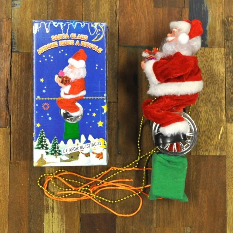 A Santa Claus riding on a 1-eze wieler.D Santa rides merrily back and forth on a rope while enjoying a merry Christmas carol.