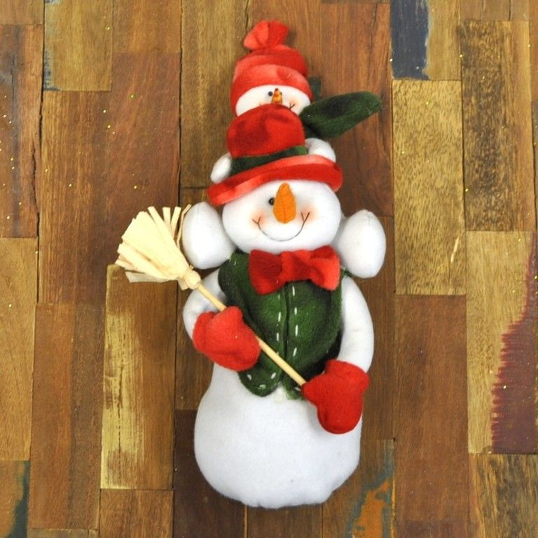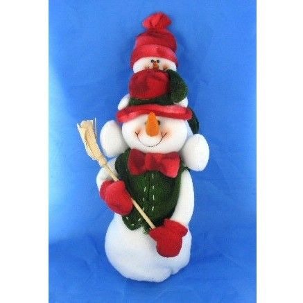 A beautiful plush snowman with a snow baby on his shoulders. The snowman has a broom in his hands. Nice decoration during the Christmas season.