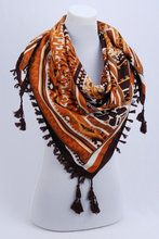 S_2149007BG - LUXURY 2-SIDED TRIANGLE SCARF BROWN / ORANGE TURQUOISE BULLETS (1st)