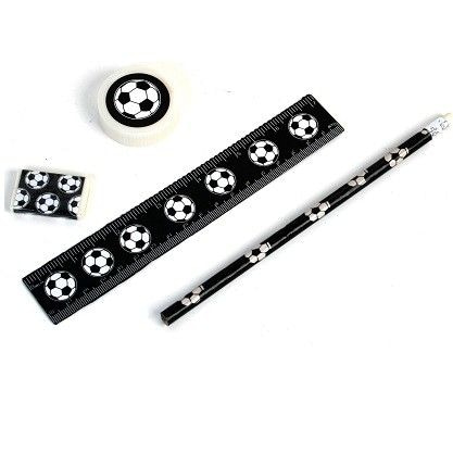 Nice 4 piece football set, consisting of: 1x ruler, 1x pencil, 1x eraser and 1x sharpener.