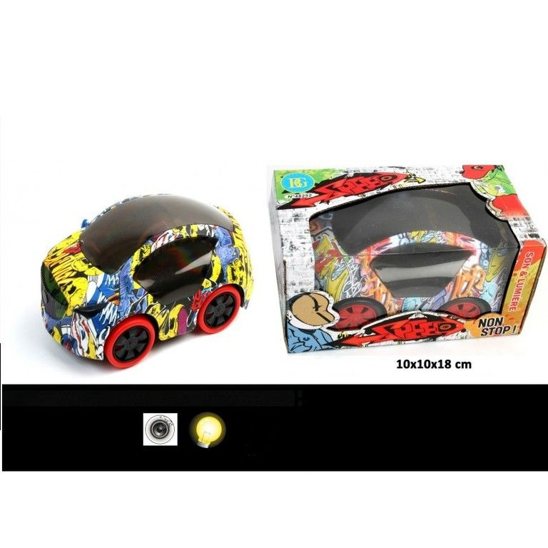 Tough Bump & Go Grafitti Car, equipped with Light & Sound. This Bump & go car works on 3x AA Bateries. As soon as this car collides with something, it automatically drives the other way.