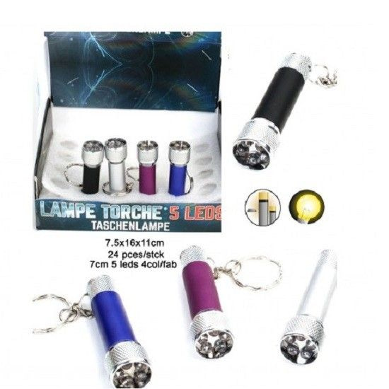 Very handy, these 5 LEDs Flashlight with a keychain on it, so you always have light at hand. Works on 1x AA battery (Battery not included) Comes in Mix colors in a display.