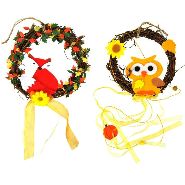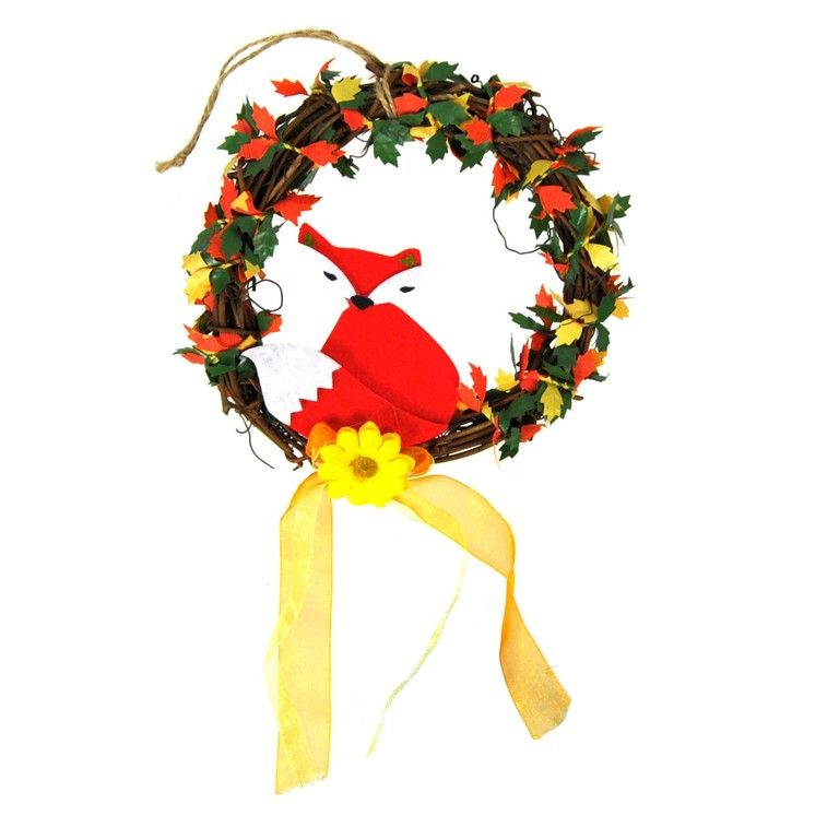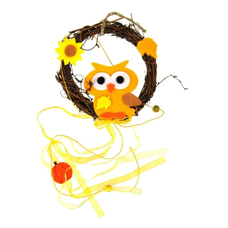 Beautiful decorations wreath of twigs and various fringe / ribbons. The crown has a diameter of approximately 15 cm. and has a fox or an owl in the middle.