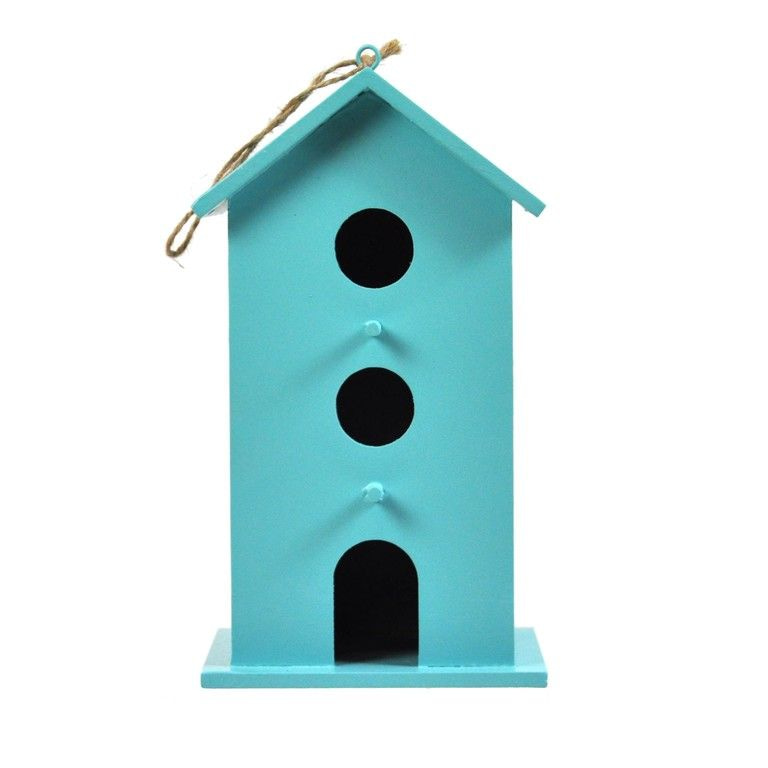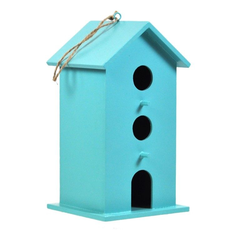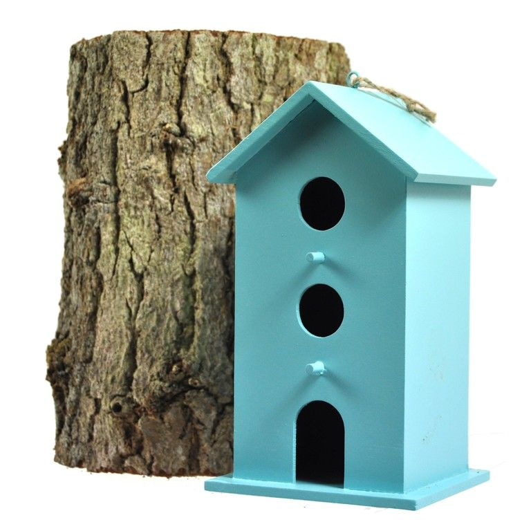 A birdhouse with a rope at the top for hanging. The front of the cottage has three holes and two sticks. Beautiful as decoration in the house and in the garden.