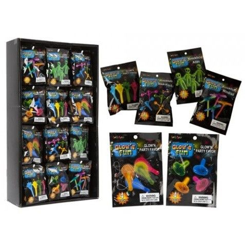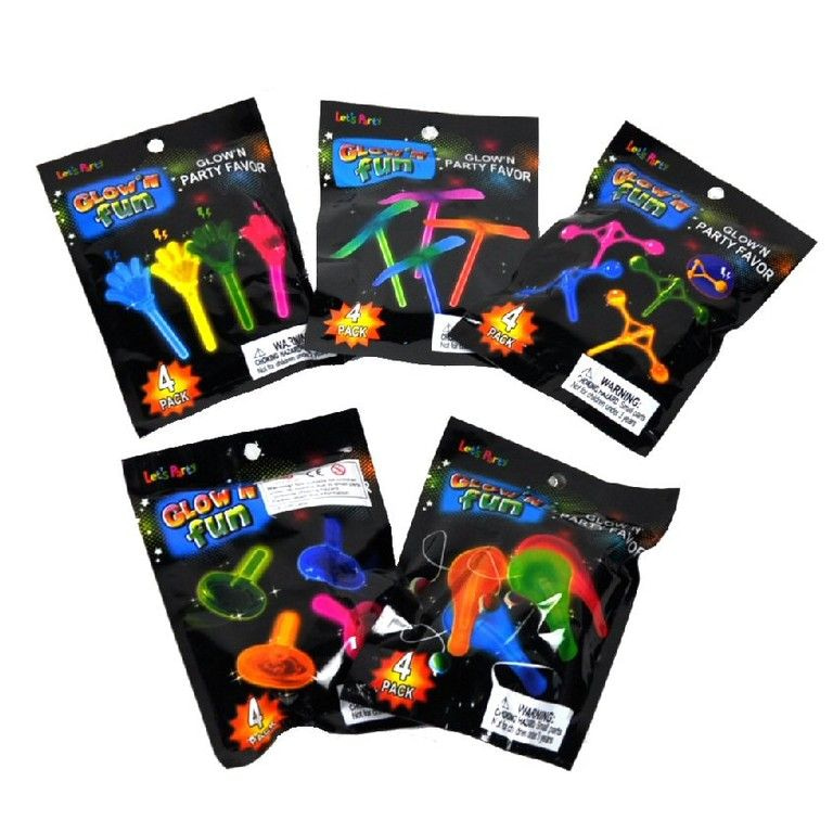 Cute little toy articles that give light in the dark. Break the swab and put it in the toy, the toy now glows in the dark. In each pouch are four toys. Comes with: