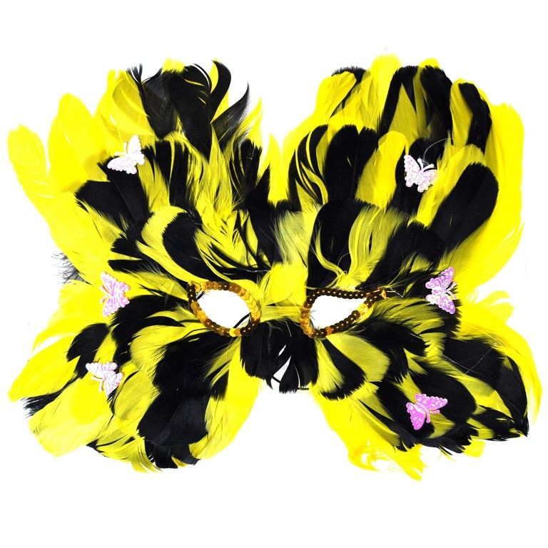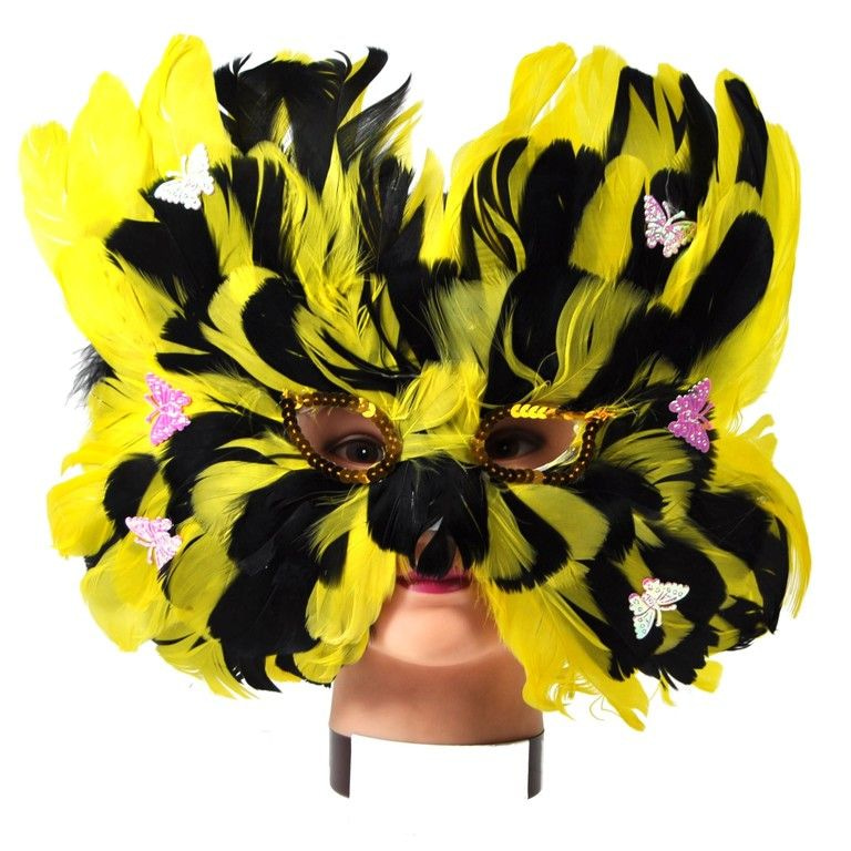 A gorgeous party mask for events, carnival and costume parties. This mask is flexible and is delicious with the face with it. The entire front of the mask is decked with yellow and black feathers.