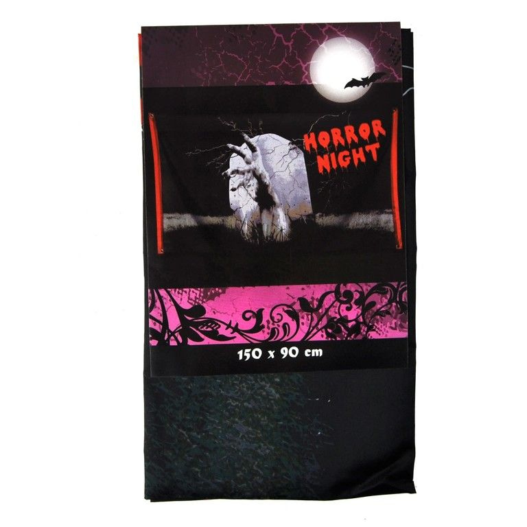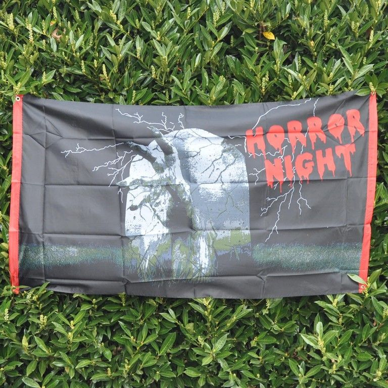 A large banner to 1.5 meters long with the text "Horror Night". The banner also be a scary picture of a zombie hand coming out of a grave.