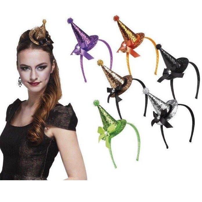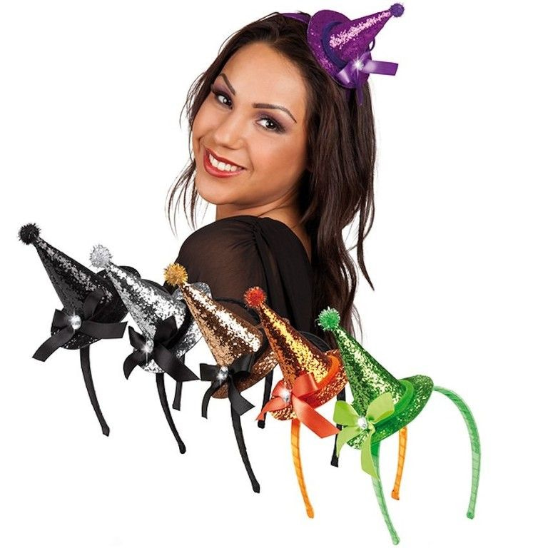 A beautiful diadem with them in small witch hat full of glitter. The crowns come in different colors and are ideal for theme parties, carnival and Halloween.