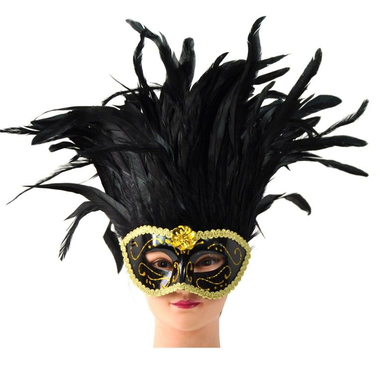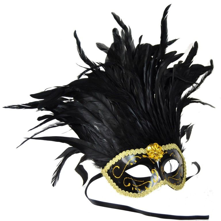 A gorgeous party mask for events, carnival and costume parties. This mask is provided with glitters on the front and black feathers on the top.