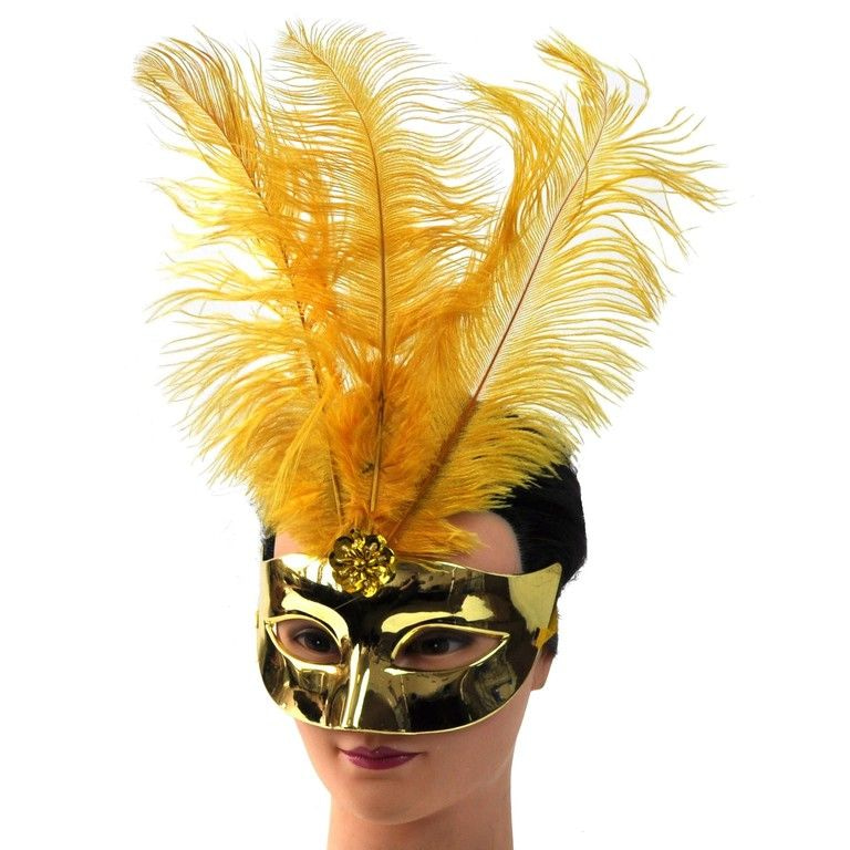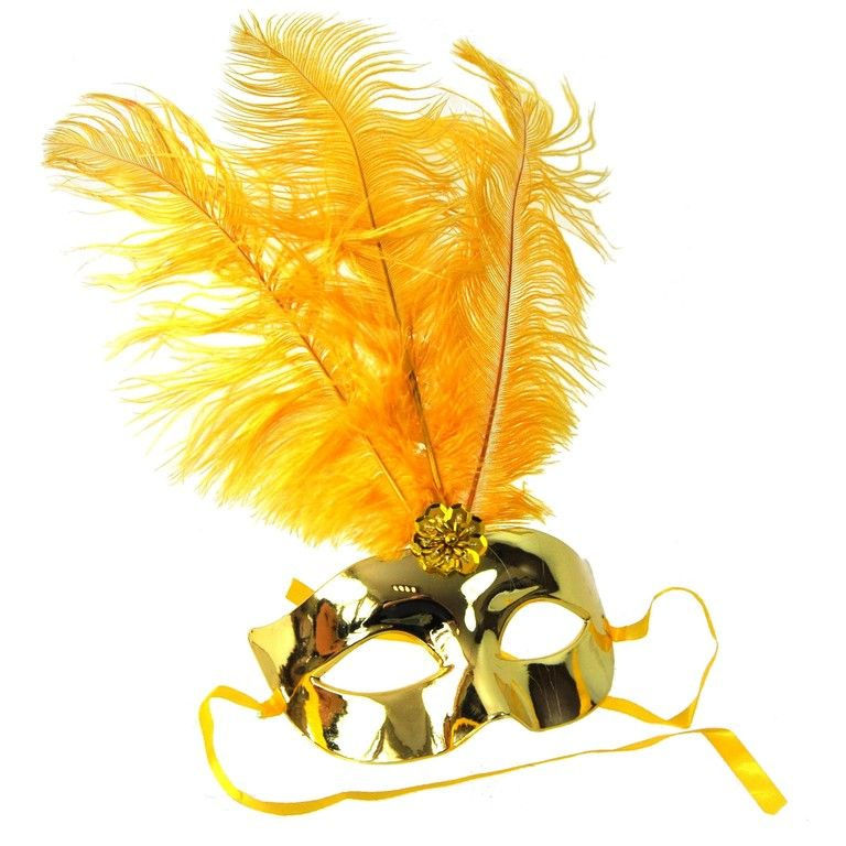 A gorgeous party mask for events, carnival and costume parties. This mask is complete and has golden feathers on the top.