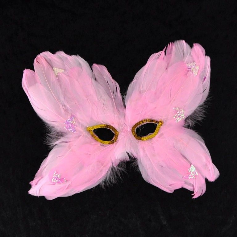 A gorgeous party mask for events, carnival and costume parties. This mask is flexible and is delicious with the face with it. The entire front of the mask is decked out with pink feathers.