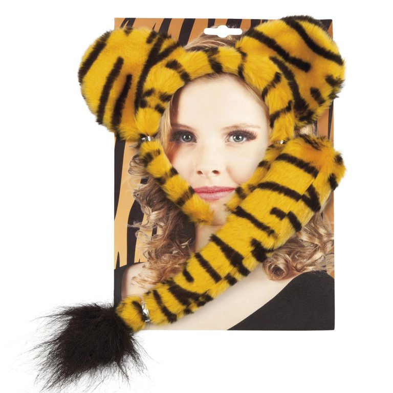 Cute dress accessories packed on a map. This set consists of a diadem with ears and a tail of a tiger. Cute as costumes during carnival, Halloween and theme parties.