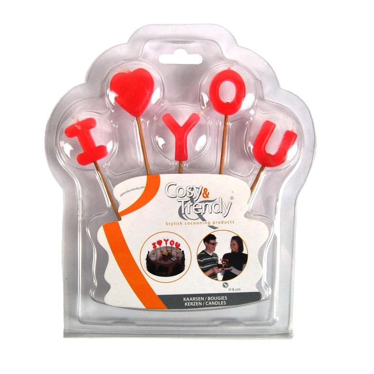 A five-piece candle set for example a cake. With these candles game you the text "I ♥ You". Fun for anniversaries, Valentine's Day, Mother's Day and many more special occasions.