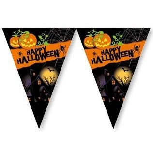 A flag line of 2.3 meter long with triangular flags. The flags are fun Halloween pictures and the text "Happy Halloween".