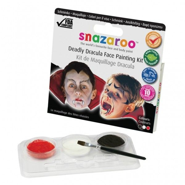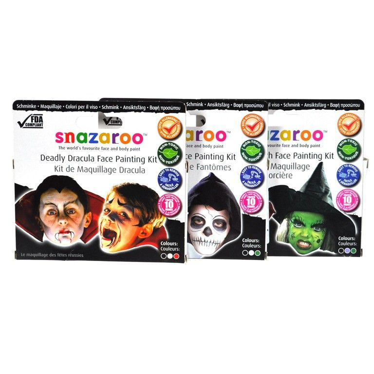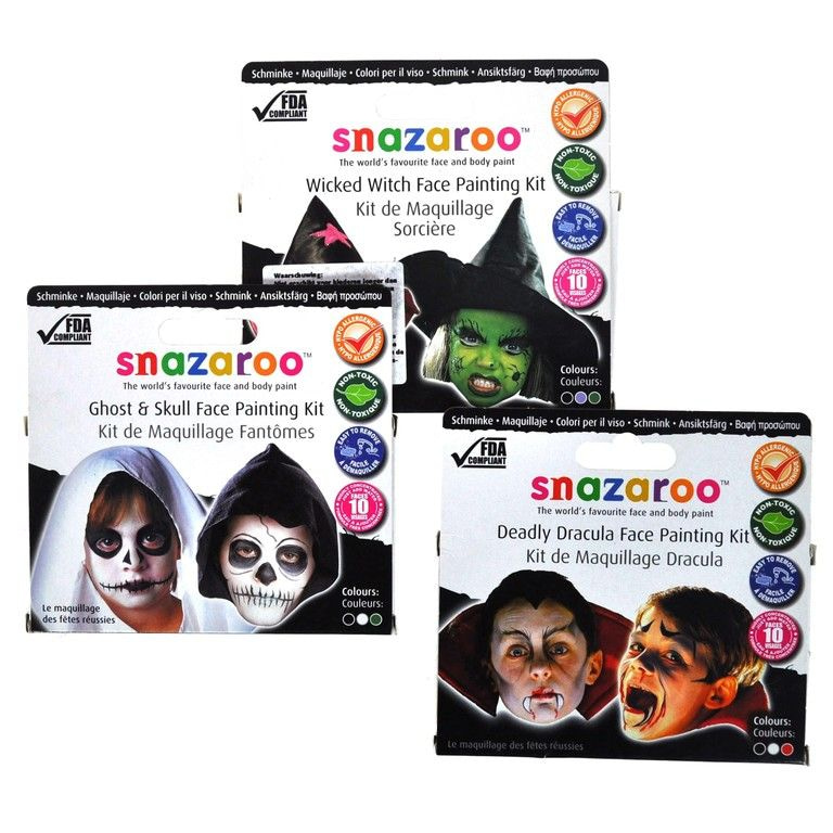 Several sets makeup for face painting several scary characters like witches, ghosts and vampires. Each set includes three colors face paint and a brush.