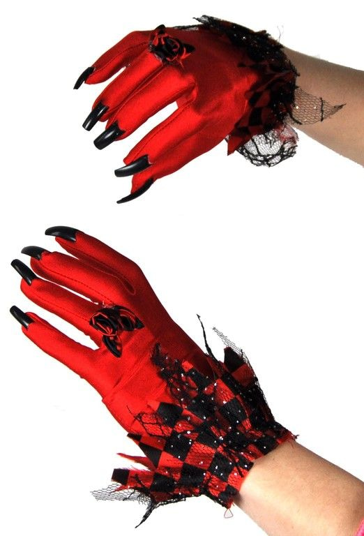 A pair of red gloves adorned with fringes at the border and long black nails. Ideal accessory for when you go dressed as a witch.
