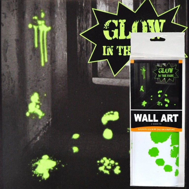 Two large sticker sheets of 70 x 25 cm. with glow in the dark stickers for the wall and the ground. The sheets contain a plurality of sticker, for example, footprints, and blood stains. Fun to decorate with a horror chamber. The sticker sheets are packed together in a transparent package.
