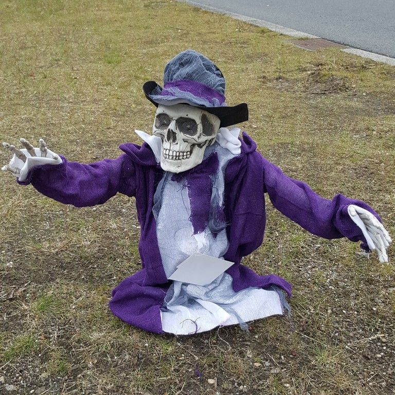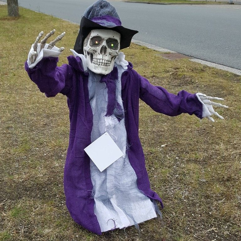 This skeleton is really scary. The skeleton is about 50 cm. High but when you press the button, the skeleton slowly slides out of the ground and moves back and forth during a scary music and lighting in his eyes. At its highest point, the skeleton is 70 cm. high.