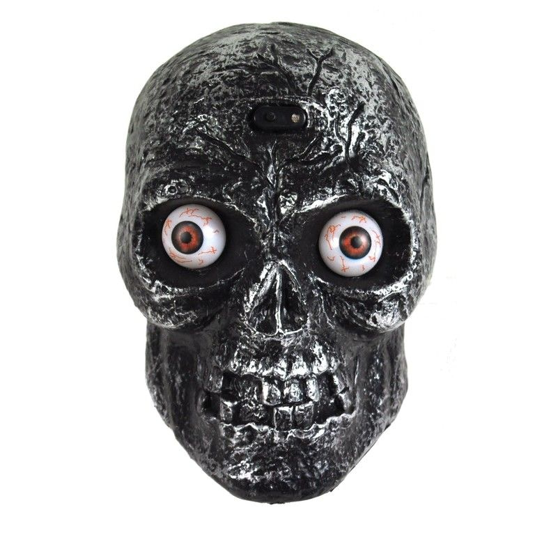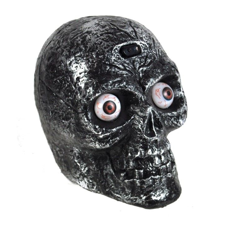 Large skull with lighting in the eyes and lots of different scary sounds. The skull is provided with a button on his forehead. When flashing press the button to start the eyes and scary sounds come out of the skull.