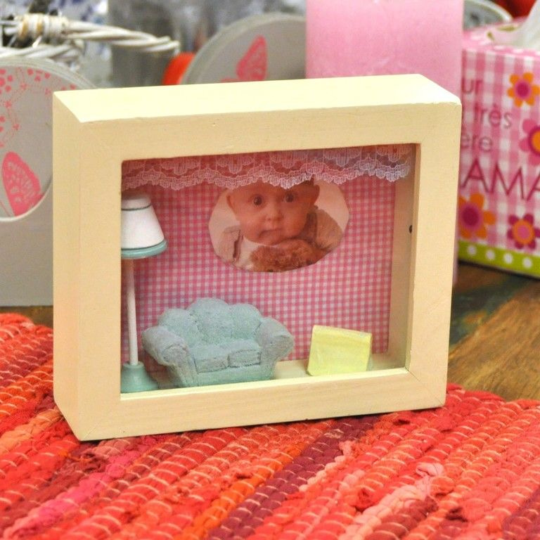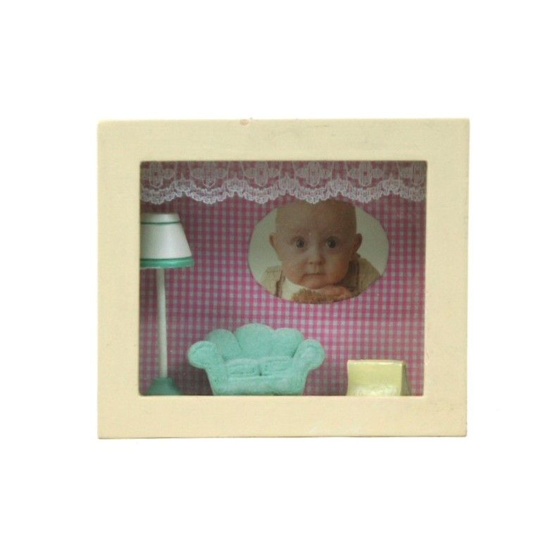 A deep picture frame with meubulair it, just like looking into a living room with a picture on the wall. The original image can be replaced by an own picture. The picture frame can be put down or suspended.