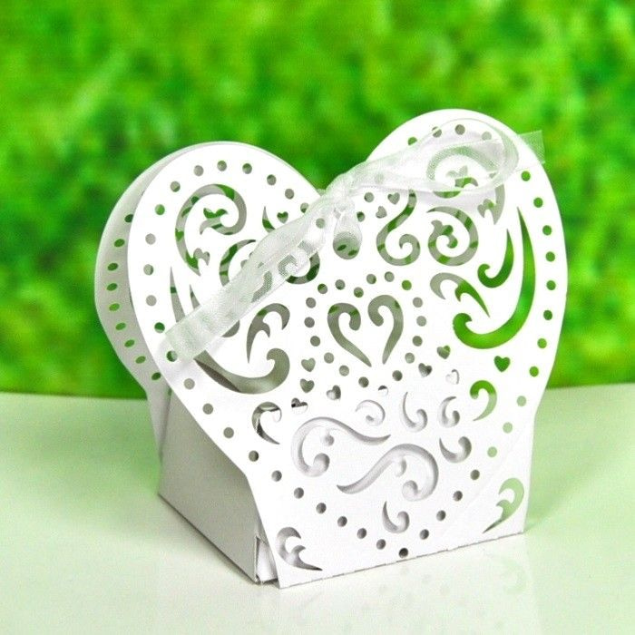 Splendid box in the shape of a heart with a nice pattern in it. Especially for treats at weddings. In this box, you can do some nice treats like coupon receipts, chocolate hearts, sugar beans or a nice present.
