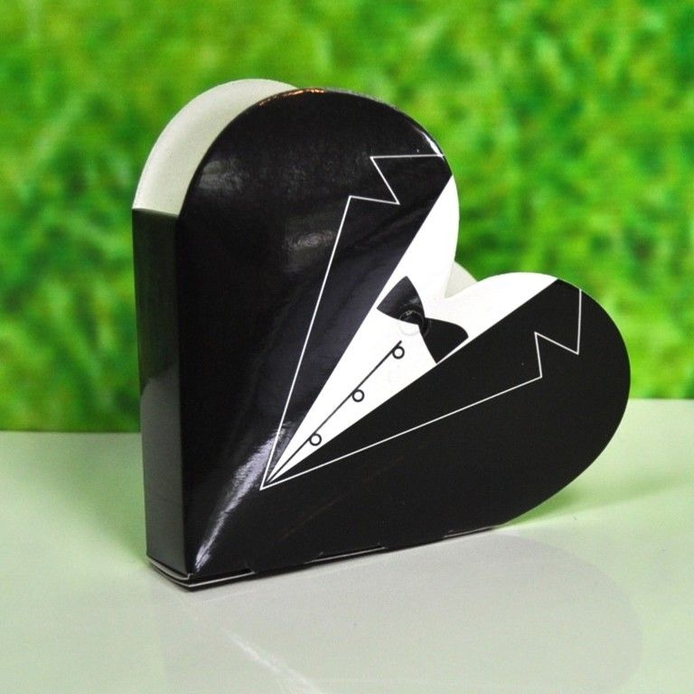 Splendid box in the shape of a heart tuxedo. Especially for treats at weddings. In this box, you can do some nice treats like coupon receipts, chocolate hearts, sugar beans or a nice present.