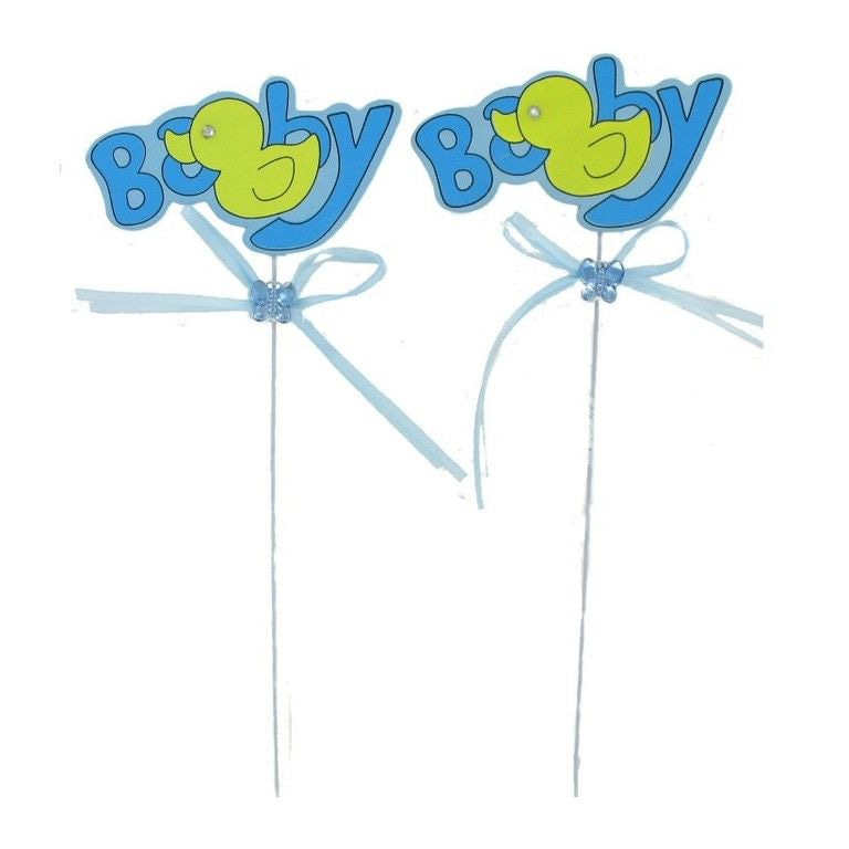 A big cake skewer in the shape of the text "baby" with a duckling in the middle. The cake skewer also has cute frills on the side.