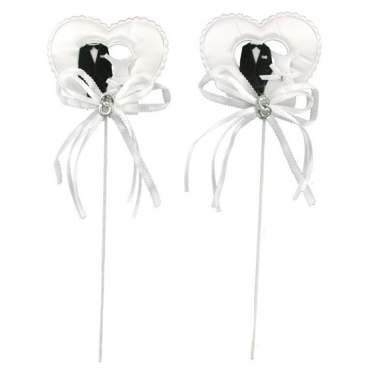 A big cake skewer in the shape a heart with a couple on it. The cake stick also has a cute bow.
