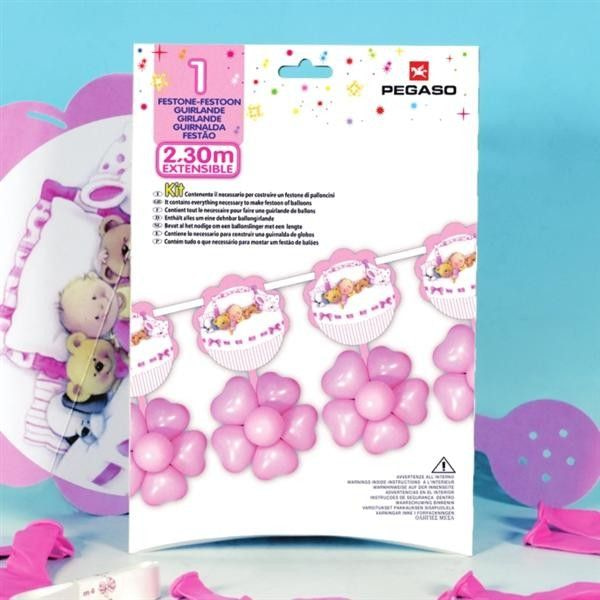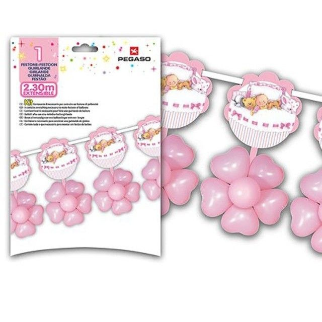 Long garland of balloons or 2.3 meters with large decorative plates. The signs are approximately 29 cm. high and have hanging a balloon at the bottom. This sling is quick and easy to assemble, and is the ideal decoration for a birth.