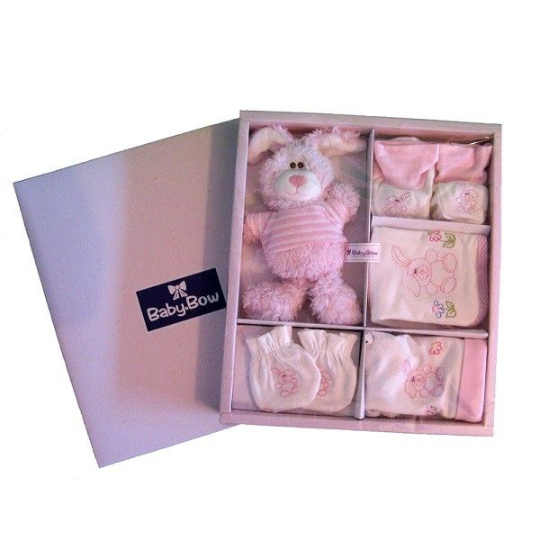 Superb gift package for a newborn girl. Beautifully packaged in a box with lid. Consisting of a bib, gloves, hat, shoes and a rabbit.