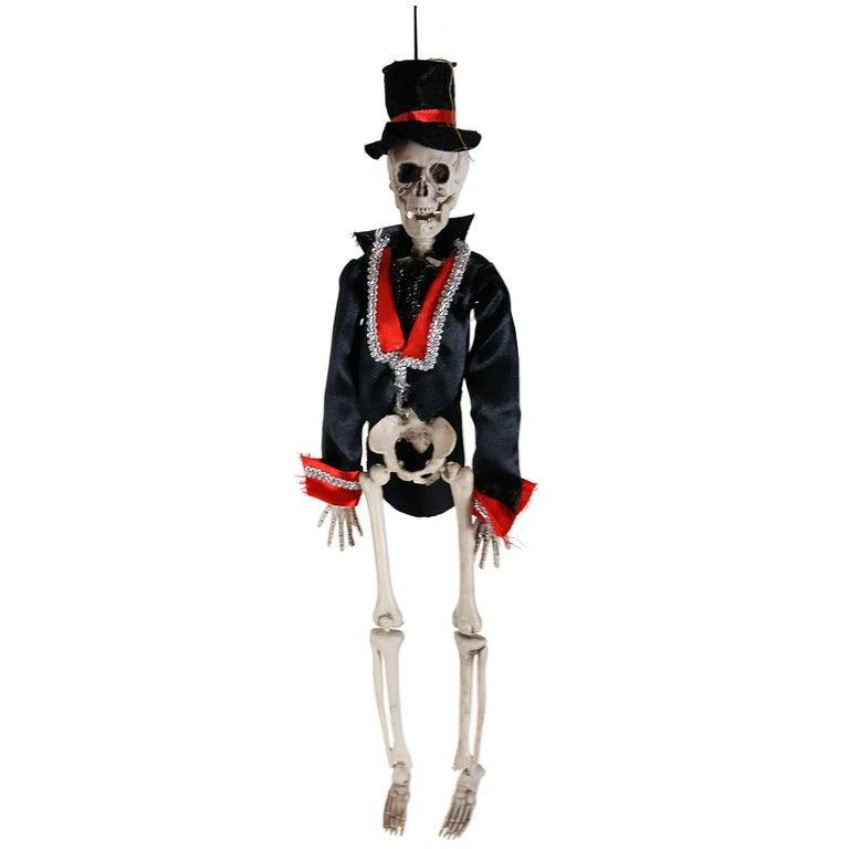A major skeleton of up to 43 cm. dressed in a jacket and top hat. Gorgeous decorations for Carnival, Halloween and theme parties.