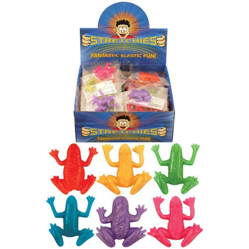 Very funny these pull-out strech frogs. Take the frog between your two fingers and make it as long as possible. Packaged in a nice display.