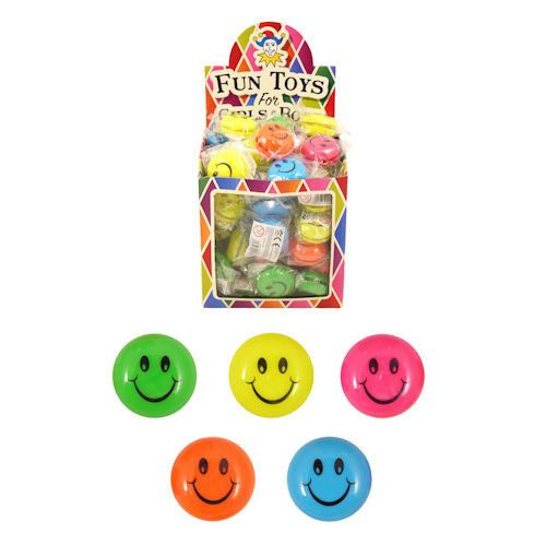 Fun Smiley jo jo's with a happy smiley print on it. The jo jo's are delivered in a variety of mix colors in a Display. This is a super nice way to give an article in the grab bag or at a children's menu.