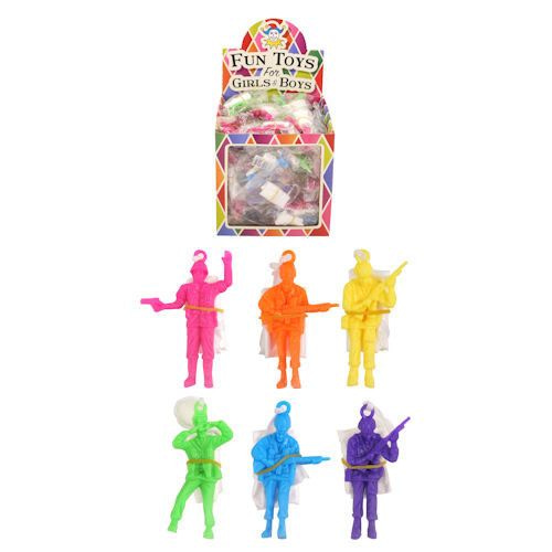 Always fun this parachutist, throw him in the air and the soldier comes down on a parachute. Comes in mix colors in a beautiful Display.