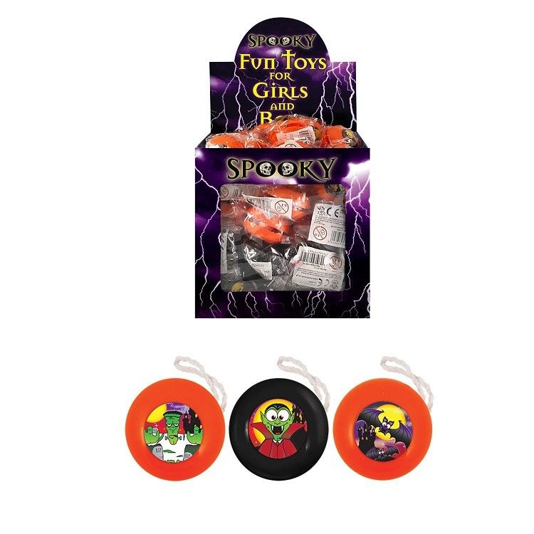 Fun Halloween jo jo's with scary Halloween print on it. The jo jo's are delivered in a variety of mix colors in a Display. This is a super nice way to give an article in the grab bag or at a children's menu.