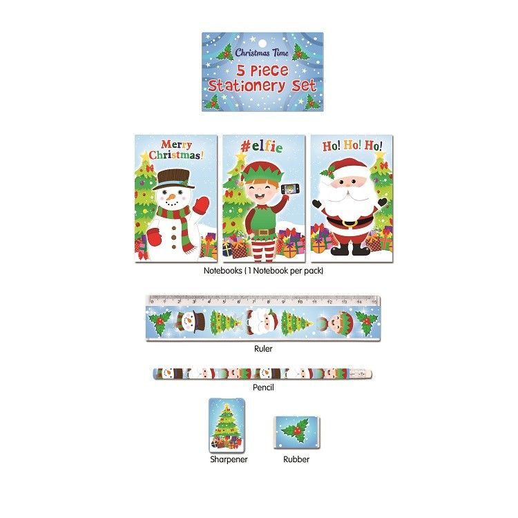 Cute 5-piece Christmas writing set consisting of: 1x Pencil, 1x Ruler, 1x Eraser, 1x Pencil sharpener, 1 x Notepad