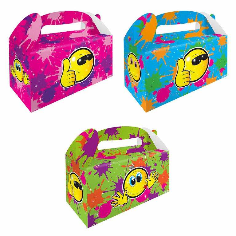 Menu box with the theme: Smiley. Dimensions 22.5 x 9.5 x 18 Cm. Comes in an assortment of smileys.
