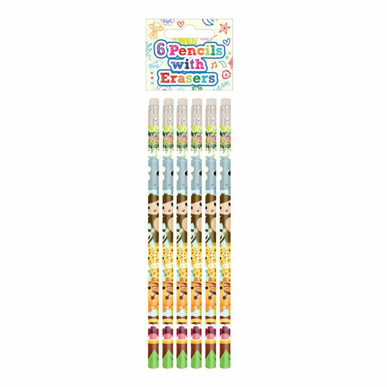 6-Delige Jungle Dieren Potlood met Gum Set, verpakt in een ophang verpakking.