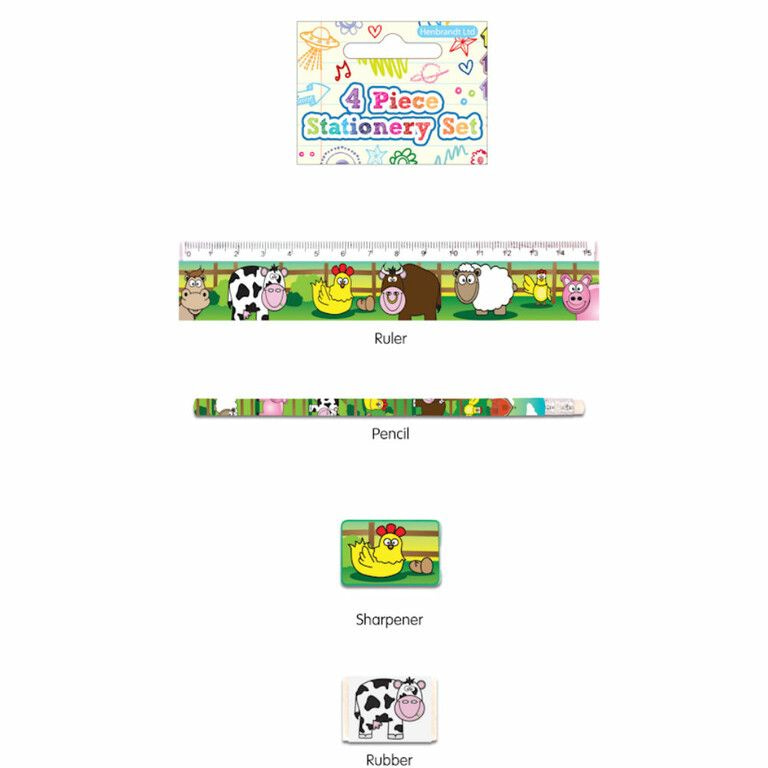 4-Delige Boerderij Dieren Staionery Set, bestaande uit: 1x Liniaal, 1x Potlood, 1x Gum, 1x Puntenslijper.