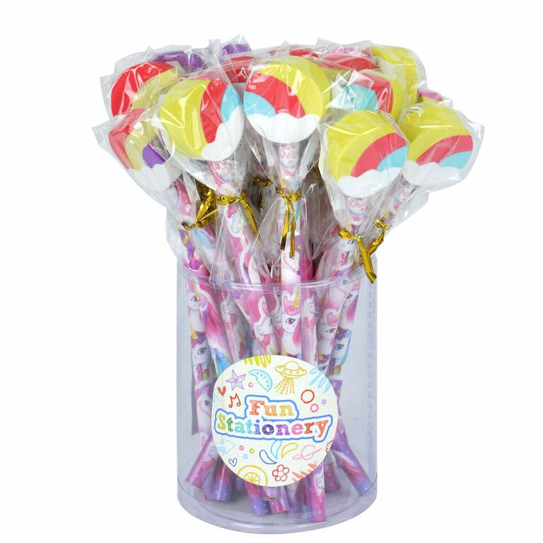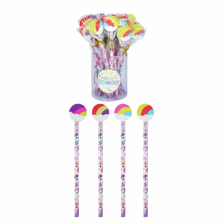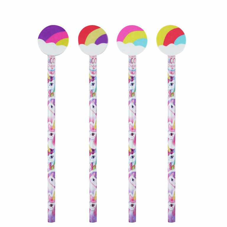 Prachtige Regenboog / Rainbow Unicorn Potlood met een grote Gum erboven op.