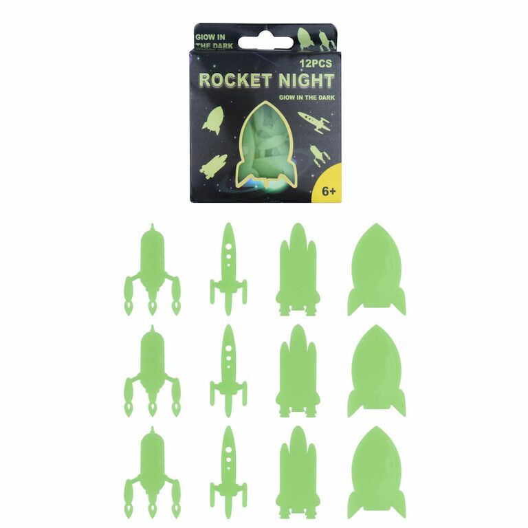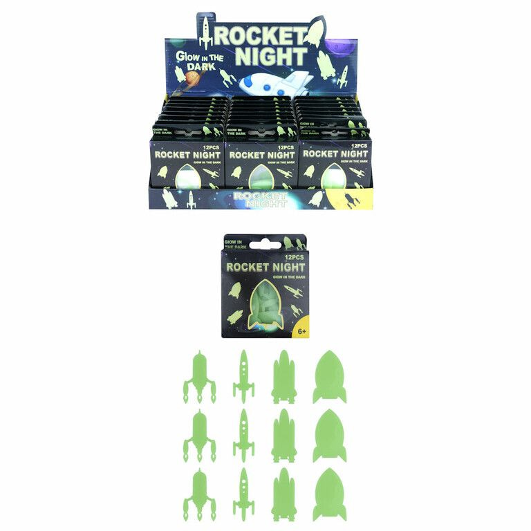 Stoer voor in elke jongens kamer, deze 12-Delige Raket Ruimtevaart Glow in the Dark Sets. Die je aan het plafond kun plakken. Elke set bestaat uit ui 12 stuks Glow in the dark Ruimtevaart stukjes. Verpakt in een display.