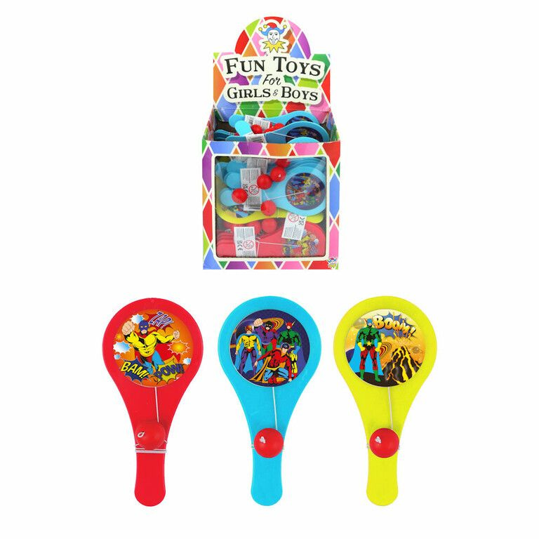 Superhelden Paddle Bat bal spel, voorzien van bal aan elastiek. Probeer de bal hoog te houden. Wordt in Mix kleuren geleverd in een Display.