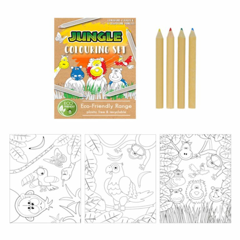Leuke ECO FRIENDLY - Jungle Dieren Tekenset, bestaande uit: 4x Kleurpotloden en 6x Kleurplaten in het Thema: Jungle Dieren