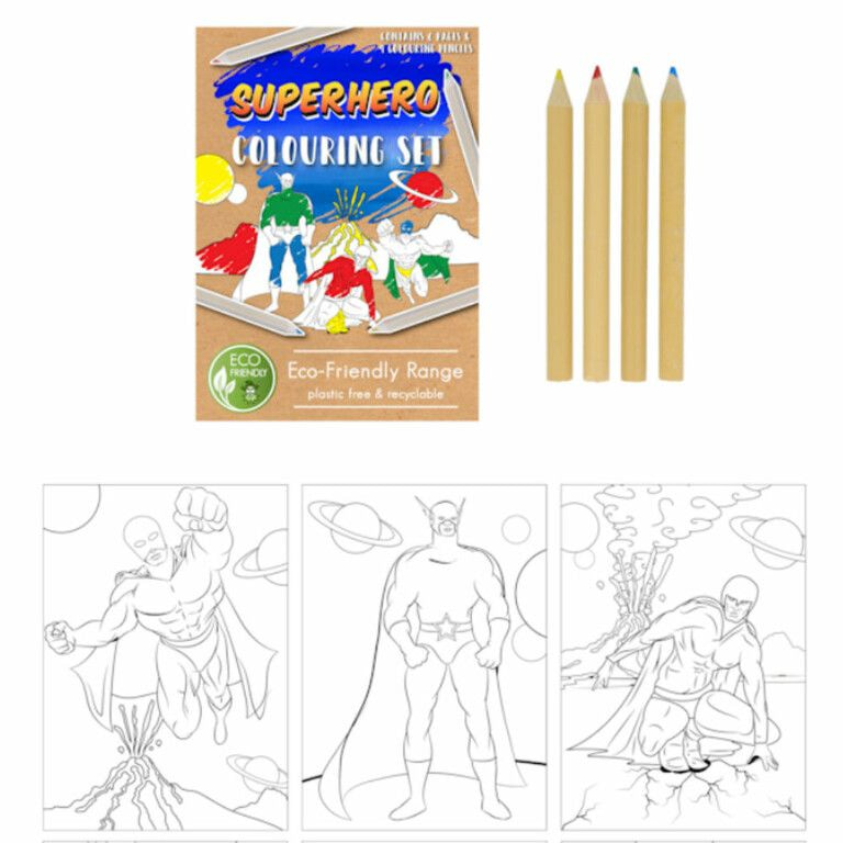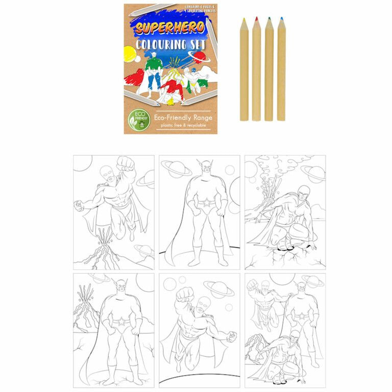 Leuke ECO FRIENDLY - Super Hero Tekenset, bestaande uit: 4x Kleurpotloden en 6x Kleurplaten in het Thema: Super Hero