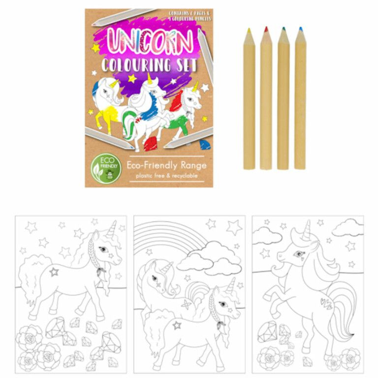 Leuke ECO FRIENDLY - Unicorn / Eenhoorn Tekenset, bestaande uit: 4x Kleurpotloden en 6x Kleurplaten in het Thema: Unicorn / Eenhoorn.