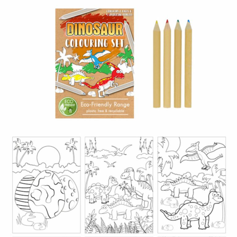 Leuke ECO FRIENDLY - Dinosaurus Tekenset, bestaande uit: 4x Kleurpotloden en 6x Kleurplaten in het Thema: Dinosaurus.