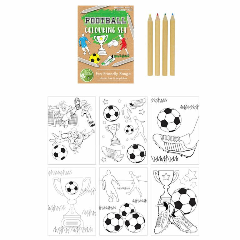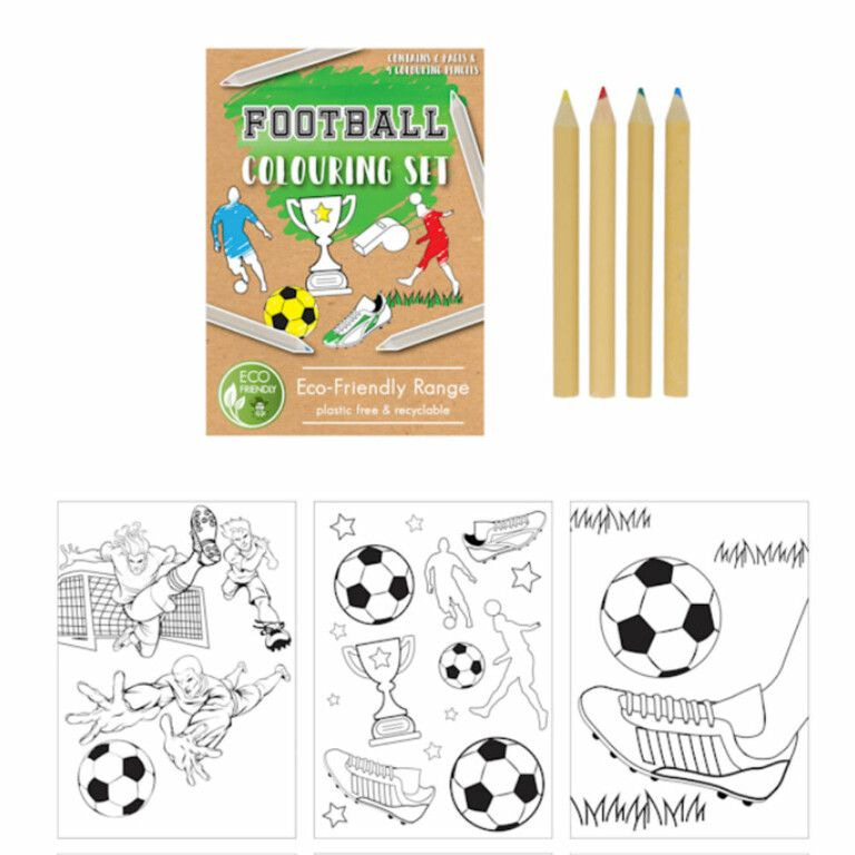 Leuke ECO FRIENDLY - Voetbal Tekenset, bestaande uit: 4x Kleurpotloden en 6x Kleurplaten in het Thema: Voetbal.