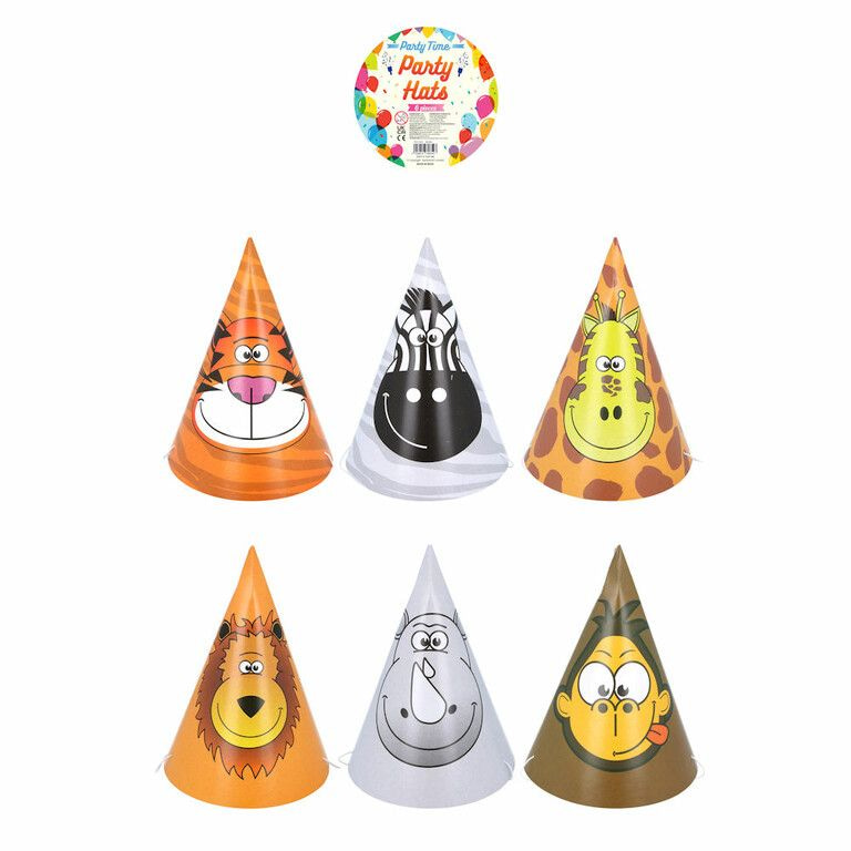 Feesthoedjes voorzien van: Mix Jungle Dieren design. Worden plat geleverd. Afmetingen feesthoed: 11 x 11 x 16 Cm.