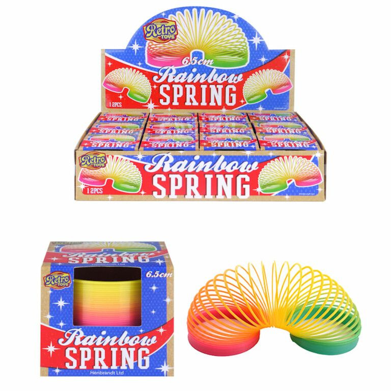 Retro Toys. Beautiful colorful rainbow spiral, individually packaged in a cute see-through box. This rainbow spiral has a diameter of 6.5 cm. Packaged in a beautiful display case.